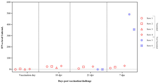 Interferon alpha (IFN-α) concentrations in sera samples were evaluated after vaccination and CSFV challenge using the previously validated in-house ELISA test. Low or undetectable IFN-α levels were registered in vaccinated sows at 10 dpv with values below 30 units/mL at 7 dpc. In the case of the two non-vaccinated sows, high levels of IFN-α were detected at 7 dpc, reaching values of 300 and 500 units/mL (Figure 3).