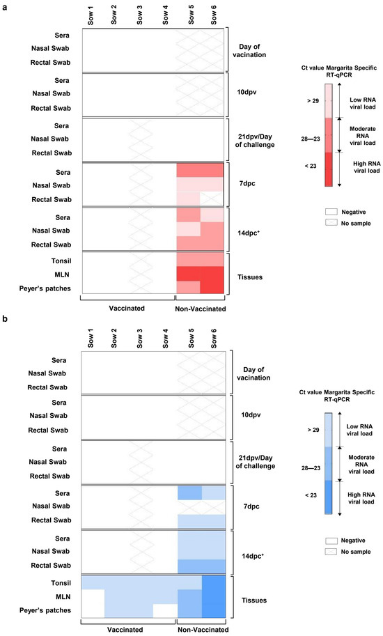 CSFV RNA detection in pregnant sows at different time points after vaccination and CSFV challenge in samples and tissues. The sample were analyzed by (a) the specific CSFV Margarita strain RT-qPCR test, represented in red, and by (b) the generic RT-qPCR test, represented in blue. The RNA load, according to the Ct value, is represented as low, moderate, or high according to the intensity of the red and blue colours in the scale for (a) and (b), respectively. Ct values above 40 were considered negative (represented by X). * The samples from sow 5 were taken at 12 dpc. MLN (mesenteric lymph node).