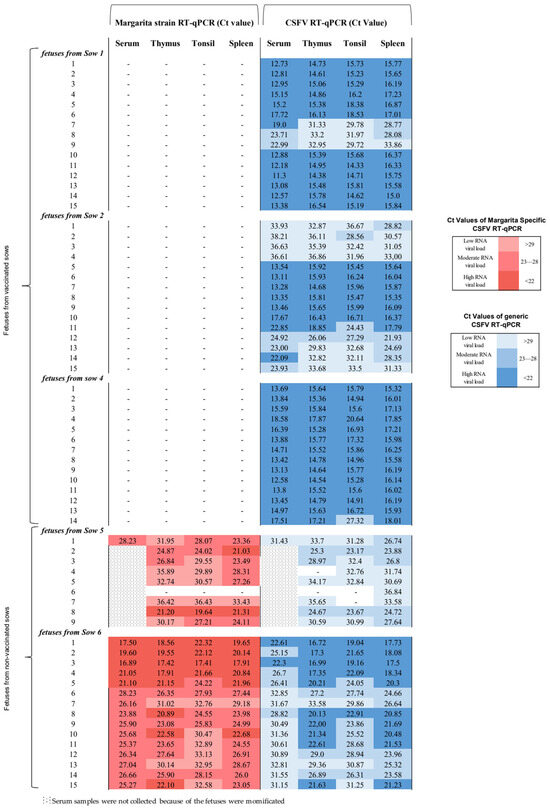 CSFV RNA detection by the RT-qPCR test in foetuses from vaccinated and non-vaccinated sows after CSFV challenge. Samples from foetuses were evaluated by the specific CSFV Margarita strain and the generic CSFV RT-qPCR assays. Results are shown in a colourimetric scale representing the range of values for the detection of both CSFVs: low for Ct values of 29 or above, moderate for Ct between 28 and 23, and high for values under 22. The results obtained are represented in red and blue for the specific CSFV Margarita and generic CSFV tests, respectively. The symbol “−” represents a negative result. In litter number 5, only one serum sample could be evaluated since the other foetuses in the litter were mummified after CSFV infection.