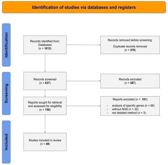 The number of articles retrieved from all databases totaled 1013, comprising 16 from Science Direct, 494 from PubMed, 257 from Web of Science, and 246 from Scopus. After eliminating duplicates across databases, 637 articles remained. An evaluation of the titles and abstracts of these articles was conducted, resulting in the exclusion of 487 articles that did not meet the established criteria. Consequently, 150 articles were selected for full-text reading, including an examination of the introduction, methods, results, discussion, and conclusion sections. Among these, 101 articles were excluded for not presenting a study model based on human tumor NGS data. All articles removed during the screening process are listed in Table S1. Ultimately, 49 articles were included in this review. Figure 1 illustrates the PRISMA flow diagram, summarizing the article selection and exclusion process.