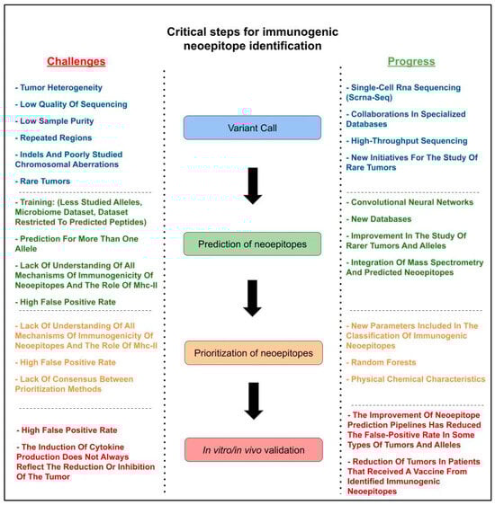 Critical steps flowchart. The figure presents the challenges (left) and current progress (right) of each of the critical steps in the identification of immunogenic neoepitopes.