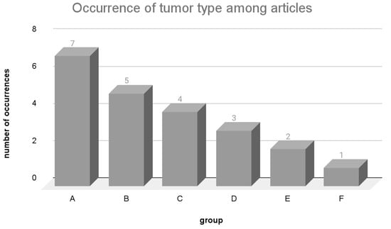 Among the analyzed articles, lung carcinoma was the most extensively studied type of tumor, featured in seven articles (group A). Group B had five articles, and the focus was on breast carcinoma, colorectal carcinoma, liver carcinoma, melanoma, and ovarian carcinoma. In the case of group C, covered by four articles, the research centered around gastric adenocarcinoma. Group D, explored in three articles, encompassed glioblastoma and pancreatic carcinoma. Group E, covered by two articles, studied B-cell lymphocytic leukemia, glioma, neuroblastoma, and prostate carcinoma. With tumors investigated in one article, group F encompassed a range of less commonly studied tumors, predominantly highlighted by a solitary article [19] that utilized database samples.
