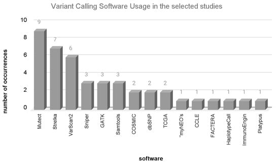 The main challenge in this step is to distinguish common (germline) variants from a somatic tumor variant [74]. Programs such “Mutect” and “Samtools” are employed for sequence alignment and to define critical cutoff points (the quality of the sequencing at the position of a nucleotide and the comparison of germline and tumor sequences), which are essential for determining which mutations are truly somatic. Figure 4 presents the variant calling programs and how frequently they were used among the selected studies.