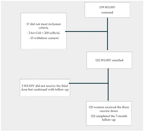 Inclusion criteria were WLHIV status, age ≥ 18 years, and the absence of simultaneous vaginal or anal infection by all seven HPV oncogenic genotypes in the nonavalent vaccine (HPV 16, 18, 31, 33, 45, 52, and 58).