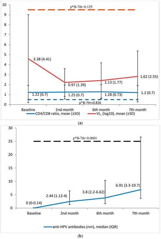 The vaccine treatment produced no changes in CD4 count (809.34 ± 367.36 cells/uL vs. 792.35 ± 349.95; p = 0.357) or plasma HIV viral load (3.38 ± 4.41 vs. 1.62 ± 2.55 cop/uL [log]; p = 0.125) between baseline and seven months. No other analytical results were outside the range of normality (Table 5 and Figure 2a).
