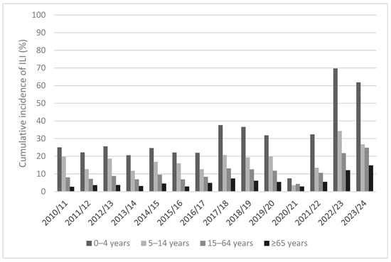 Cumulative incidence of ILI (%) from 2010/2011 to 2023/2024 season by age groups.