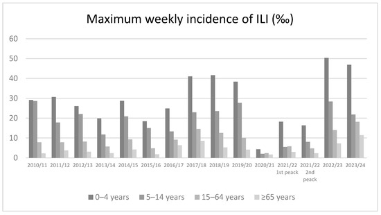 Maximum weekly incidence of ILI (‰) from 2010/2011 to 2023/2024 season by age groups.