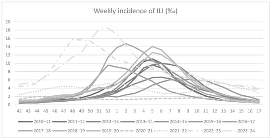 Weekly incidence of ILI (%) from 2010/2011 to 2023/2024 seasons.