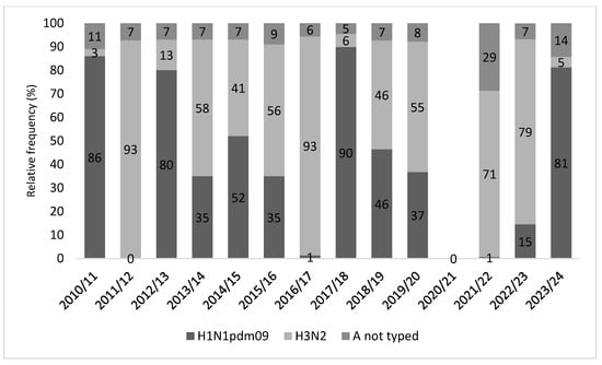 Distribution of influenza A viruses from 2010/2011 to 2023/24 season.