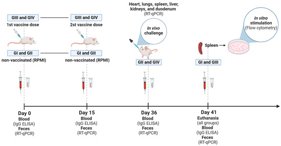 Experimental design. Timeline of GI (non-vaccinated and in vitro stimulated), GII (non-vaccinated and challenged), GIII (vaccinated and in vitro stimulated), and GIV (vaccinated and challenged) groups, highlighting the time points (Days 0, 15, 36, and 41) of blood and feces collection, administration of inactivated Senecavirus A vaccine (first and second doses) and euthanasia of mice. Illustration created with BioRender.com (accessed on 28 June 2024).