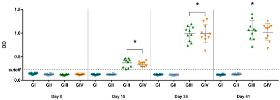 ELISA for detection of IgG against SVA at 0, 15, 36, and 41 dpv. The values are presented individually for each animal in its respective treatment group (GI—non-vaccinated; GII—non-vaccinated and challenged; GIII—vaccinated; GIV—vaccinated and challenged. The mean and ± standard deviation are represented by the black line ahead of the values. * p values ≤ 0.05 were considered statistically significant.