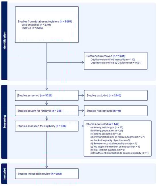 A total of 5057 potential studies were identified through the literature search, and 1731 duplicates were removed before screening. Titles and abstracts for 3326 studies were screened. Of these, 386 met the inclusion criteria for full-text evaluation. Finally, 242 studies underwent extraction. The full list of articles included is in Table S1.