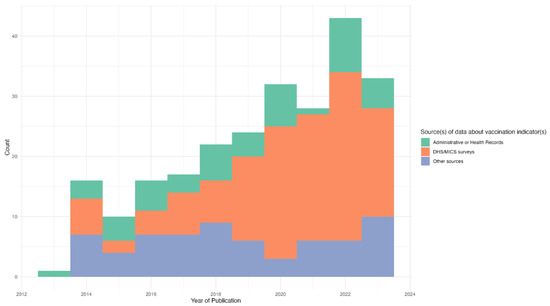 Publications of studies of inequalities in childhood vaccine coverage between 2013 and 2023 by data source for vaccine indicators (N = 242).