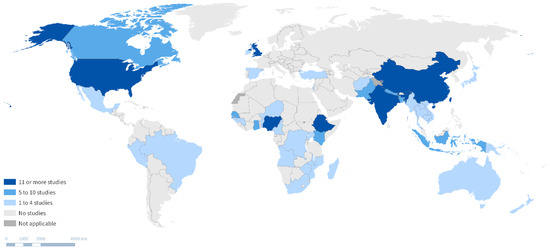 Global map of countries where studies on inequalities in childhood vaccination have been conducted between 2013 and 2023.