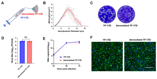 The 17D aerosol was collected in a 1.5-mL EP tube and centrifuged for 1 min at 8000 rpm for quantitative reverse transcription PCR (RT-qPCR), immunofluorescence staining, and plaque assays. Virus titer, replication curve, and protein expression were compared with the original solution.