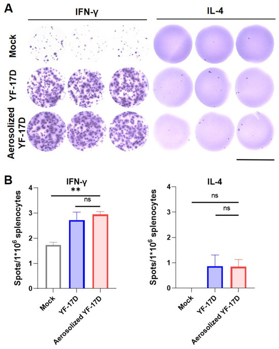 Cellular immunity of aerosolized YF-17D in A129 mice (A) ELISpot results measured with the AID ELISpot reader. To detect YF-17D-specific T-cell responses, cytokine screening of splenocytes was performed by IFN-γ and IL-4 ELISPOT, splenocytes harvested from A129 immunized (n = 3~4) with 1 × 104 PFU of YF-17D at three weeks post-vaccination. The image is referenced with a scale bar representing 6.4 mm. (B) Quantification of YF-17D-specific IFN-γ and IL-4-producing T cell. The data were shown as mean ± SD. Significance was calculated using one way ANOVA (n.s., not significant; **, p < 0.01).