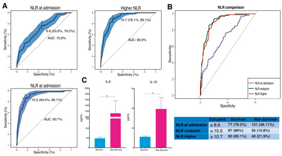 3.5. Predictive Significance of NLR and Cytokine Levels in COVID-19 Survival