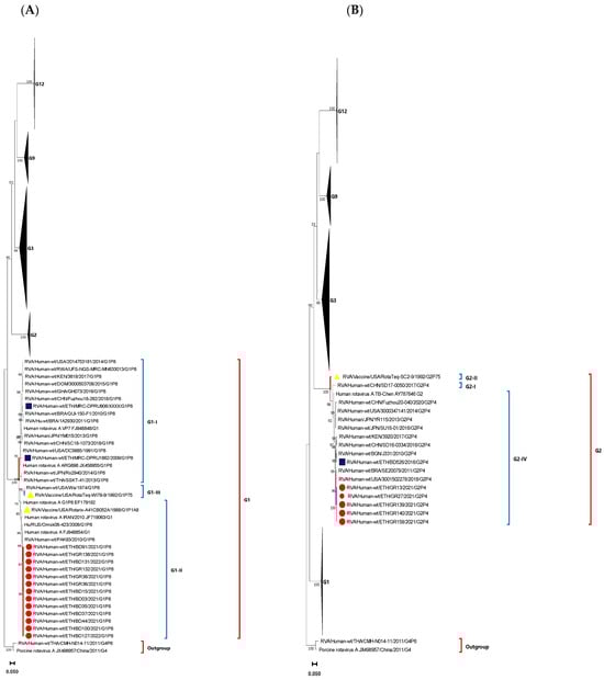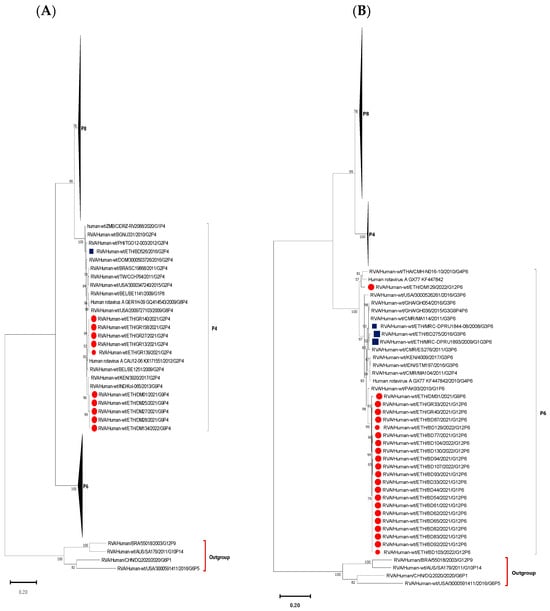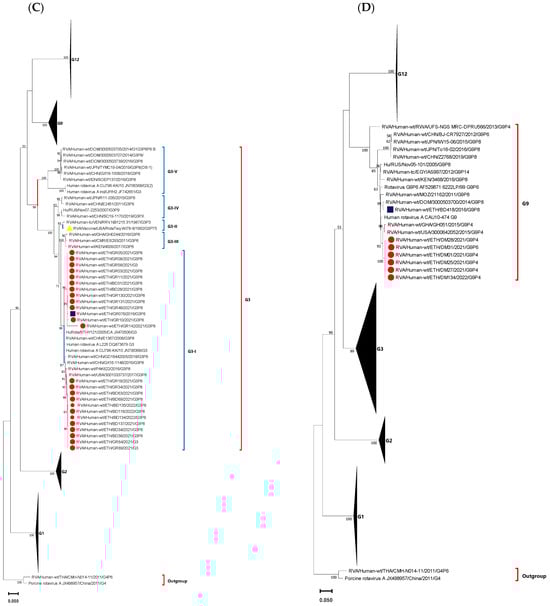 The VP7 and VP4 sequence data were verified by Basic Local Alignment Search Tool for Nucleotides (BLASTN) analysis on the National Center for Biotechnology Information (NCBI) database and a web-based RVA Genotyping Tool Version 0.1 (available at: https://www.rivm.nl/mpf/typingtool/rotavirusa/job/462661131/ (accessed on 30 May 2024)) to determine the G-types and P-types of the sequenced RVA VP7 and VP4 genes, respectively [33]. Multiple sequence alignments were conducted using the CLUSTAL Omega tool integrated into the Molecular Evolutionary Genetics Analysis (MEGA) version 11 software. Subsequently, phylogenetic trees were constructed using maximum likelihood method and General Time Reversible model validated by 1000 bootstrap replicates as previously reported [34]. Sequence data generated in this study were deposited at GenBank and assigned accession numbers PQ001370–PQ001437 and PQ001438–PQ001502 for VP7 and VP4 gene sequences, respectively.