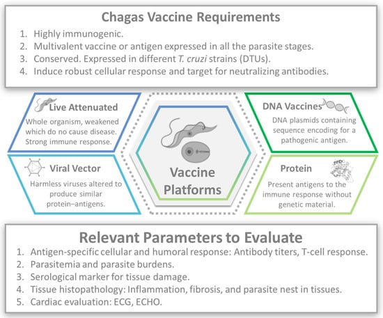 Nevertheless, vaccines are one of the most effective tools for preventing infectious diseases []. Several preclinical vaccine candidates for CD have been investigated in animal models. These candidates aim to elicit an immune response against T. cruzi, with humoral and cell-mediated immune responses to extracellular trypomastigotes and intracellular amastigotes (Figure 1).