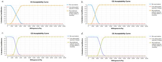 - Pieters, Z.; Ogunjimi, B.; Beutels, P.; Bilcke, J. Cost-Effectiveness Analysis of Herpes Zoster Vaccination in 50- to 85-Year-Old Immunocompetent Belgian Cohorts: A Comparison between No Vaccination, the Adjuvanted Subunit Vaccine, and Live-Attenuated Vaccine. Pharmacoeconomics 2022, 40, 461–476. [Google Scholar] [CrossRef] [PubMed]
