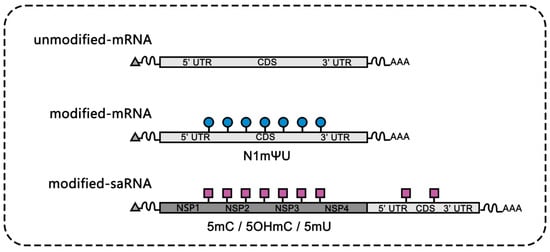 - Komori, M.; Morey, A.L.; Quiñones-Molina, A.A.; Fofana, J.; Romero, L.; Peters, E.; Matsuda, K.; Gummuluru, S.; Smith, J.F.; Akahata, W.; et al. Incorporation of 5 methylcytidine alleviates innate immune response to self-amplifying RNA vaccine. bioRxiv 2023. [Google Scholar] [CrossRef]