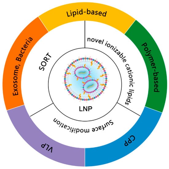 - Zong, Y.; Lin, Y.; Wei, T.; Cheng, Q. Lipid Nanoparticle (LNP) Enables mRNA Delivery for Cancer Therapy. Adv. Mater. 2023, 35, e2303261. [Google Scholar] [CrossRef]