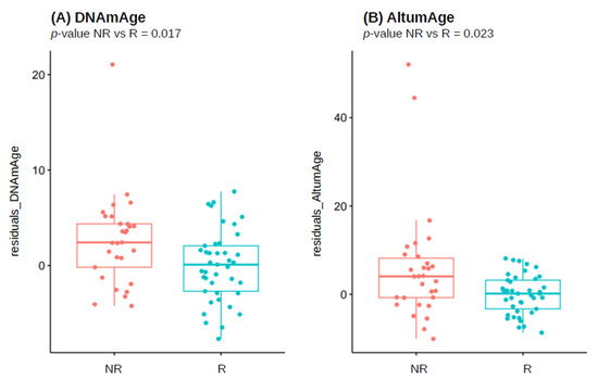 Boxplots presenting difference in residuals of: (A) Horvath’s DNAmAge, (B) AltumAge between responders (R) and non-responders (NR) of entire studied cohort, after adjustment for chronological age. Nominal p-values from 2SR analysis are reported.