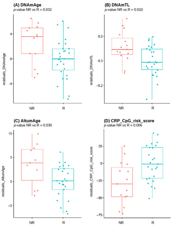 Boxplots presenting difference in residuals of: (A) Horvath’s DNAmAge, (B) DNAmTL, (C) AltumAge, (D) CRP_CpG_risk_score, between female responders (R) and non-responders (NR) of studied cohort, after adjustment for chronological age. Nominal p-values from 2SR analysis are reported.