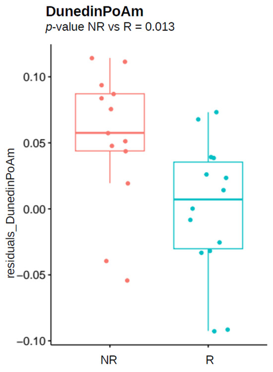 The differences between R and NR male HCWs in DNAm-based estimates were less evident than in females, as shown by the results summarized in Table 5. The only DNAm-based estimate that reached statistical significance was the DunedinPoAm marker (nominal p-value of 0.013), indicating higher pace of aging among male NR individuals compared to R (Figure 3). However, the variable did not remain significant after BH correction for multiple tests.