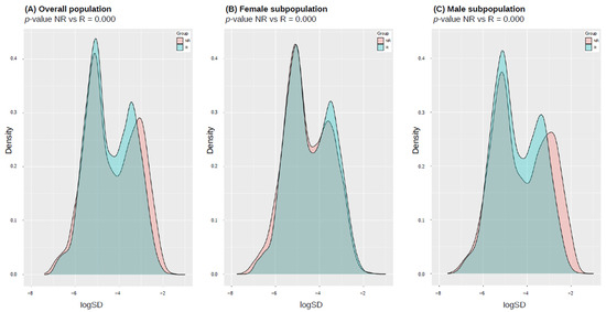 Density plots visualizing the distribution of standard deviation values in clock CpGs after logarithmic transformation in responders (R) and non-responders (NR) in (A) overall population, (B) female and (B,C) male subpopulations. p-values from two-sample Kolmogorov–Smirnov test are reported.