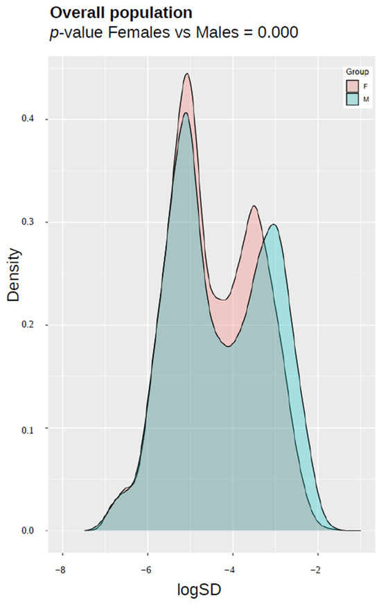 Density plots visualizing the distribution of standard deviation values after logarithmic transformation in female and male subpopulations. p-value from two-sample Kolmogorov–Smirnov test is reported.