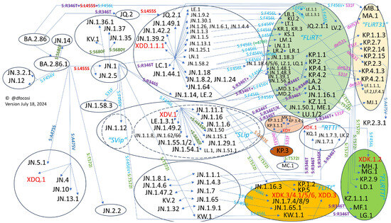 Accessory proteins (AP, i.e., ORF3a, ORF6, ORF7a, ORF8, ORF9b, and N*) are all encoded by subgenomic mRNAs, are less essential than SPs and NSPs, and are mainly involved in interferon antagonism and immune evasion [111]. Several lines at the end of 2023 had an entire deletion of ORF7a, ORF7b, and ORF8; they were GE.1.2.1, GW.5.1.1, FW.1.1, and JP.1.1.