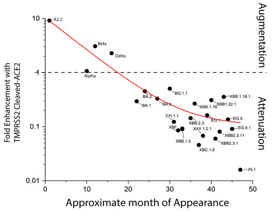 The decrease in ACE2 affinity caused by Q493E can be reversed in the presence of L455S + F456L, as observed in BA.2.86 and in XBB.15 [53]. These compensatory mutations significantly increase ACE2 affinity and re-establish acidity in the unusually basic RBM, which includes additional mutations like V445H, N481K, and A484K in BA.2.86. Figure 5 delineates how alterations in the Spike protein incrementally dampened the efficacy of TMPRSS2-mediated cleavage of ACE2 over time.