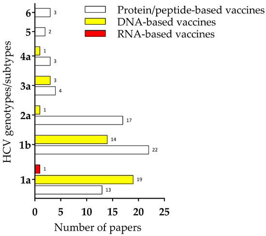 The simian adenovirus vector, ChAdOx1, and the modified virus Ankara (MVA) were used to express the E2 from genotypes 1 to 6 (Gt1-6) and a modified E2 with or without a deletion of the variable regions (E2Δ123HMW—high molecular-weight) for mouse vaccination in the study by Donnison and colleagues [31]. The monovalent vaccination (Gt1-6 and E2Δ123) elicited a higher E2-specific CD8+ T-cell response (against genotype 1a, but not against genotype 1b), compared to the bivalent scheme (Gt1-6-E2Δ123). Conversely, the bivalent vaccination elicited a greater genotype 3a-specific IFN-γ CD4+ and genotypes 1a- and 1b-specific IFN-γ CD8+ T-cell response, when tested against NS peptide pools (NS3, NS4, and NS5), compared to the monovalent vaccination. When assessing a different vaccination scheme (i.e., prime/boost/boost), the ChAd-Gt1-6-E2Δ123 priming and two boosts with MVA-Gt1-6-E2Δ123 elicited a higher frequency of tumor necrosis factor (TNF)-α- and IFN-γ-producing T cells.