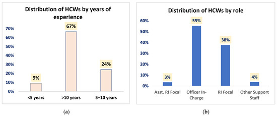 Distribution of healthcare workers by years of experience (a) and role (b).
