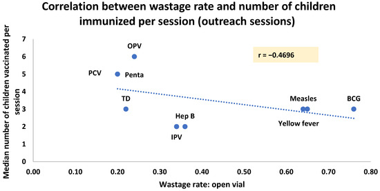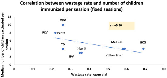 We noted a negative correlation between the number of children vaccinated and the wastage rates for both the fixed (r = −0.56) and outreach sessions (r = −0.56) (see Figure 4 and Figure 5).