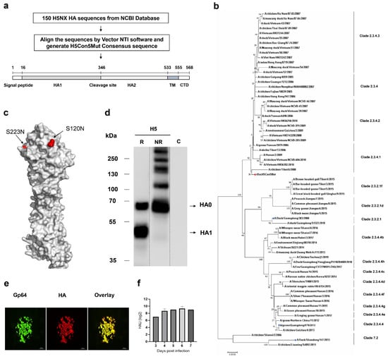Design and characterization of rBacH5Con5Munt recombinant virus. (a) A total of 150 H5NX HA sequences were obtained from the NCBI database and aligned by Vector NTI software. A consensus H5NX HA sequence was generated and named as H5Con5Mut. (b) Phylogenetic analysis of HA sequences of H5Nx isolated from poultry, the location of consensus H5Con5Mut HA, and the challenge virus used in this study are shown in the tree. (c) The 3D structure model based on consensus HA protein is shown and the locations of the S120N and S223N mutations are highlighted in red on the structure. (d) H5 HA expression from rBacH5Con5Mut with (R) or without (NR) 10× reducing agent were confirmed by WB. The SF+ cells infected with wild-type baculovirus were set as a mock control indicated as C. (e) Dual IFA staining of H5 HA and Gp64 by corresponding antibodies. (f) Expression of H5 HA was confirmed by HA assay.