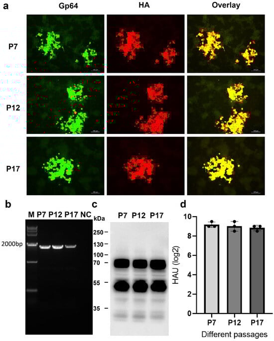 Genetic stability of HA in rBacH5Con5Mut. The rBacH5Con5Mut virus was continuously passaged in SF+ cells from P7 to P17. (a) Dual IFA staining of H5 HA and Gp64 protein of rBacH5Con5Mut P7, P12, and P17 viruses infected in Sf9 cells. (b) The presence of the H5 HA gene in the recombinant baculovirus from different passages was confirmed by PCR (~1800 bp). (c,d) H5 HA expression from rBacH5Con5Mut P7, P12, and P17 viruses was confirmed by Western blot and HA assay.