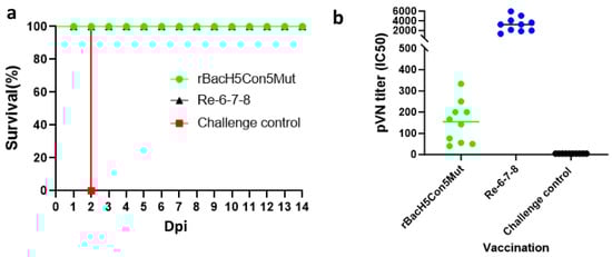 Survival rate of the chickens intranasally challenged with clade 2.3.4.4 H5N1 HPAI and pVN antibody titers at 21 dpv. Three-week-old SPF chickens were randomly divided into three groups: 10 chickens were immunized with rBacH5Con5Mut, 10 chickens were immunized with the inactivated whole-virus Re-6-7-8 vaccine, and 10 chickens were injected with PBS (challenge control group). At 21 dpv, the chickens were infected with (a) clade 2.3.4.4 H5N1 HPAI viruses. Clinical signs were observed for 14 days. (b) pVN titers of the chicken serum were tested in 2.3.4.4 challenging study using 14079-pseudovirus.