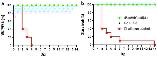 Survival rate of the chickens intranasally challenged with clade 2.3.2.1 and clade 7.2 H5 HPAI. Three-week-old SPF chickens were randomly divided into three groups: 10 chickens were immunized with rBacH5Con5Mut, 10 chickens were immunized with the inactivated whole-virus Re-6-7-8 vaccine, and 10 chickens were injected with PBS (challenge control group). At 21 dpv, the chickens were infected with (a) clade 2.3.2.1 H5N2 HPAI and (b) clade 7.2 H5N2 HPAI viruses. Clinical signs were observed for 14 days.