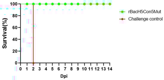After lethal challenge, all chickens were monitored for 14 days for clinical signs and mortality. The non-immunized chickens showed the typical clinical signs, such as purple comb, hemorrhage of foot scale, and palpebral edema, and all birds died within two days, suggesting that 14079 virus infection is highly lethal to these chickens. However, none of the chickens immunized with the rBacH5Con5Mut vaccine showed any clinical symptoms during the observation period, and the survival rate was 100% (Figure 5).