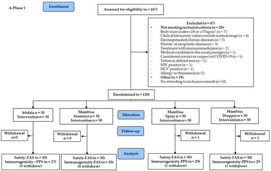 In Phase 2, subjects were randomized in two groups for the Abdala and Mambisa vaccinations (Figure 1B). Enrollment/allocation was made after the main researcher verified compliance with the subject selection and exclusion criteria.