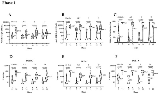 Quantitative results for immunogenicity variables in both study phases, at the beginning (Day 0) and 14 days after the booster dose (Day 14). ACE2: Angiotensin-converting enzyme 2. AU/mL: arbitrary units per mL. AZ, S and D: Mambisa nasal application devices (atomizer, spray and dropper). NAb: neutralizing antibody titers. RBD: receptor binding domain. Brackets contain the results of the Wilcoxon matched-pairs signed rank test. Numbers represent GMT (mean in the case of inhibition). Phase 1: graphs represent vaccination groups: Abdala (n = 27) and Mambisa AZ (n = 30), S (n = 29) and D (n = 29). Panel (A): anti-RBD IgG titers. Panel (B): anti-RBD IgA titers. Panel (C): inhibition percentages of RBD-ACE2 binding. Panels (D–F): NAb titers in Abdala (n = 15) and Mambisa AZ (n = 15), S (n = 15) and D (n = 14) vaccination groups against D614G, Beta and Delta SARS-CoV-2 variants, respectively. Phase 2: graphs represent vaccination groups: Abdala (n = 509) and Mambisa (n = 494). Panel (G): anti-RBD IgG titers. Panel (H): anti-RBD IgA titers. Panel (I): inhibition percentages of RBD-ACE2 binding. Panels (J,K): NAb titers for Abdala (n = 50) and Mambisa (n = 52) vaccination groups against D614G and Omicron (BA.5) SARS-CoV-2 variants, respectively.