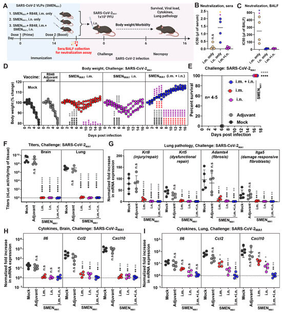 Enhanced Protection Against Lethal SARS-CoV-2 Challenge in K18-hACE2 Mice via Systemic and Mucosal SMEN Vaccine Administration (A) A scheme showing experimental design for comparing protective efficacy of SAR-CoV-2 VLP (SMENWA1) vaccine using various routes. A total of 250 µg of SMEN vaccine was used to immunize K18-hACE2 mice as depicted intramuscularly (i.m.) or i.n. using the prime-boost strategy. A total of 30 μg of vaccigrade TLR7/8 agonist R848 was used as an adjuvant for the i.m. route. Adjuvant and untreated mice served as control groups. A total of 21 days after immunization, sera/ bronchioalveolar lavage fluids (BALF) were harvested (before challenge), or mice challenged i.n. with 1 × 105 PFU of SARS-CoV-2WA1 and indicated parameters were analyzed to assess protection. (B,C) Neutralizing titers (IC50) in the sera and BALF from indicated groups of vaccinated as in (A). (D) The graph illustrates the changes in body weight over time for K18-hACE2 mice following infection. Each line represents an individual animal, with the initial weight set at 100%. (E) The plot displays Kaplan-Meier survival curves for the experiment described in (A). (F) The graph shows the viral load measurements in various organs at the time of necropsy, expressed as nLuc activity per milligram of tissue, using Vero-E6 cells as targets. (G) Fold change in mRNA expression of indicated lung pathology markers, Krt8, Krt5, Adamts4, and Itga5 in the lung tissue after necropsy. (H,I) Changes in specific cytokine mRNA expression levels were measured in mouse brain and lung tissues following specified treatment protocols. These measurements were taken either at the time of death or at 16 dpi for surviving mice. The data were standardized against Gapdh mRNA from the same sample and from uninfected mice after necropsy in the experiments depicted in (G–I). Statistical analysis for data in (B,C) employed the nonparametric Mann-Whitney test. For grouped data in (D) and (F–I), a two-way ANOVA was conducted, followed by Tukey’s multiple comparison tests to assess significance. Statistical significance for the group comparisons to mock is shown in black, with adjuvant shown in light dark, with SMENWA1 i.m. shown in red, and SMENWA1 i.n. shown in magenta. *, p < 0.05; **, p < 0.01; ***, p < 0.001; ****, p < 0.0001; ns, not significant; Mean values ± SD are depicted.
