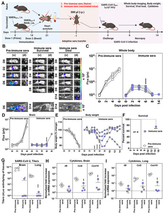 The combined regimen of SMEN vaccine delivery elicited potent nAbs in both BALF and sera (Figure 1B,C). To ascertain if antibodies contributed to vaccine-mediated protection, we investigated whether passive transfer of sera from vaccinated mice can confer protection in naïve mice against SARS-CoV-2-induced mortality. To gain deeper insights into the impact of sera on virus replication and dissemination, we used our bioluminescence imaging (BLI)-guided platform, which enables real-time longitudinal monitoring of virus replication using nanoLuc luciferase (nLuc)-expressing reporter SARS-CoV-2WA1-nLuc [34,37,38]. Pre-immune sera or sera from vaccinated mice (immune sera) were collected and adoptively transferred (i.p.) to naïve K18-hACE2 mice one day before the lethal challenge with SARS-CoV-2WA1-nLuc (Figure 2A). BLI and nLuc flux quantification showed that the pre-immune sera-treated groups experienced uncontrolled virus replication in the lungs, which spread to the brain, leading to more than 20% body weight loss and 100% mortality. (Figure 2B–F). In contrast, 75% of mice treated with immune sera exhibited reduced virus replication from 2 to 6 dpi in the lung, followed by its clearance at 8 dpi (Figure 2B,C and Figure S2). Although one mouse in the group receiving immune sera exhibited a below-detection nLuc signal in the lung at 8 dpi, it lost body weight after a brief recovery period from 8 to 10 dpi. BLI revealed that the virus had spread to the brain, resulting in its death (Figure 2B–F and Figure S2). Viral load and inflammatory cytokine mRNA analyses in the target tissues corroborated our BLI analysis and revealed significant control of virus replication and inflammation in the mice receiving immune sera (Figure 2G–I and Figure S2C). Therefore, our analyses indicate that the humoral immune response elicited by the SMEN vaccine plays a major role in curbing virus replication and establishing immune control.