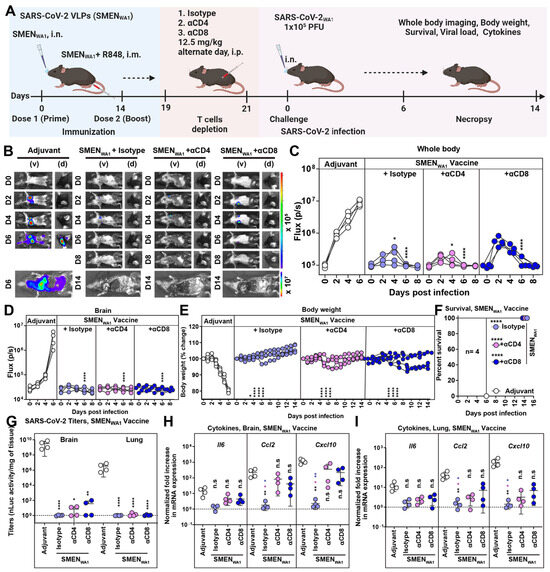 Minor Yet Distinct Role of CD8+ and CD4+ T Cells in SMENWA1 Vaccine-mediated Protection. (A) Experimental design to test the contribution of CD4+ and CD8+ T cells in SMEN-vaccine meditated protection. K18-hACE2 mice were immunized as shown using the combined regimen with SMENWA1. Adjuvant-treated mice served as control. αCD4 and αCD8alpha mAbs (12.5 mg/kg body weight, i.p.) were used to deplete CD4+ and CD8+ T cells every 48-h starting at 19 days post-vaccination. Isotype mAb treated cohorts served as controls (Isotype). The mice (n = 4 each group) were challenged with 1 × 105 PFU of SARS-CoV-2WA1-nLuc and followed by non-invasive BLI every 2 days from the start of infection till 8 dpi. (B) BLI images show nLuc signals in mice infected with SARS-CoV-2WA1-nLuc in ventral (v) and dorsal (d) view. (C,D) Non-invasive measurement of nLuc signal as flux (photons/sec) over time (E) The graph illustrates the changes in body weight over time for K18-hACE2 mice following infection. Each line represents an individual animal, with the initial weight set at 100%. (F) The plot displays Kaplan-Meier survival curves for the experiment described in (A). (G) The graph shows the viral load measurements in various organs at the time of necropsy, expressed as nLuc activity per milligram of tissue, using Vero-E6 cells as targets. (H,I) Changes in specific cytokine mRNA expression were measured in mouse brain and lung tissues following specified treatment protocols. These measurements were taken either at the time of death or at 16 dpi for surviving mice. The data were standardized against Gapdh mRNA from the same sample and from uninfected mice after necropsy in the experiments depicted in (G–I). A statistical analysis was conducted for grouped data in (C–E) and (G–I), and a two-way ANOVA was conducted, followed by Tukey’s multiple comparison tests to assess significance. Statistical significance for the group’s comparisons to adjuvant are shown in black, with the CD4+ T-cells depleted group shown as magenta and with the CD8+ T-cells depleted group shown as blue. *, p < 0.05; **, p < 0.01; ****, p < 0.0001; ns, not significant; Mean values ± SD are depicted.