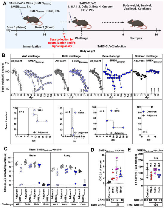 The Omicron variants have a constellation of mutations in S (37 mutations in Omicron BA.1 compared to WA1) [55] that allows evasion of vaccine/infection-induced immunity from previous variants. Hence, we explored if the SMEN vaccine with the more divergent Omicron spike can elicit broader immunity and demonstrate better protection. Towards this end, we challenged adjuvant-treated and SMENOmicron vaccinated K18-hACE2 mice (combined regimen) with ancestral (WA1), Delta, Beta, and Omicron (BA.1) variants. The Omicron VOC does not produce a lethal infection in the K18-hACE2 mouse model, and the mice recover in 3–4 days after exhibiting a brief reduction in body weight that peaks at 2 dpi [34]. We, therefore, terminated the Omicron VOC-challenged cohorts of mice at 3 dpi (Figure 5A). Our data revealed that immunity elicited by the SMENOmicron vaccine was effective against Omicron VOC as immunization prevented body weight loss and significantly reduced viral loads in the lungs compared to adjuvant-treated mice (Figure 5B,C). Surprisingly, the SMENOmicron vaccine did not offer 100% protection against the three strains tested. It provided limited protection, with survival rates of 50%, 0%, and 25% with delayed death against lethal challenges with the ancestral, Delta, and Beta variants, respectively (Figure 5B). The viral loads mirrored the survival data, showing diminished virologic control for all three strains tested, except for the homologous Omicron VOC, where the vaccine demonstrated the highest efficacy (Figure 5C and S5A). Analysis of pro-inflammatory cytokines corroborated these observations and revealed that the SMENOmicron vaccine reduced mRNA expression of Ccl2 (1.7–6-fold in the brain and 2.5–5.3-fold in the lung) and Cxcl10 (1.8–10.1-fold in brain and 1.5–7.4-fold in the lung) when challenged with heterologous SARS-CoV-2 strains. However, the SMENOmicron vaccine was significantly more effective in reducing inflammation (22–26-fold reduction in the brain; 6.5–14.3-fold in the lung) when challenged with homologous strain (Figure S5B,C). Western blot analyses confirmed that sera from SMENOmicron-vaccinated mice had reactivity against the proteins in SMEN particles, including spike proteins from heterologous variants, demonstrating successful immunization and elicitation of the expected immune response (Figure S5D). To understand the limited protection offered by the vaccine, we analyzed the sera from SMENOmicron-vaccinated mice before the challenge for cross-reactive neutralizing and Fc-signaling activity (Figure 5D,E, Table 1). Indeed, the SMENOmicron vaccine exhibited a low total CRNI of 31. The CRNI was lowest against the Delta VOC (5), followed by Beta (10) and WA1 (16), mirroring the level of protection and overall disease burden observed in the survival analyses (Figure 5D, Table 1). Evaluation of SMENOmicron-elicited sera for cross-reactive Fc-signaling index revealed broad activity against the three strains that totaled 190 (Figure 5E). The data imply that although the antibodies elicited by the SMENOmicron vaccine do not exhibit high cross-neutralizing activity against previous variants, which is a crucial first line of defense, they were able to bind S on infected cells and were capable of eliciting Fc receptor signaling. Overall, our data indicate that antibodies elicited by the Omicron Spike had a reduced ability to neutralize previous VOCs (Table 1) owing to its extensive divergence, making the SMENOmicron vaccine less effective against these earlier variants in mice.