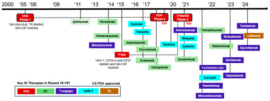 The field of immuno-oncology (IO) has shown significant advancements over the years with the introduction of US FDA-approved therapies such as immune checkpoint inhibitors (ICI) (e.g., anti-CTLA-4, anti-PD-1, and anti-PD-L1) [1], oncolytic viruses (OVs) like T-VEC (Talimogene laherparepvec) [2,3], chimeric antigen receptor (CAR)-T cell therapies [4], T cell engager therapies [5,6], and tumor-infiltrating lymphocytes (TIL) [7] (Figure 1). However, dose optimization primarily based on the traditional 3+3 dose-escalation design has been insufficient to determine the most appropriate dose due to a wide therapeutic window, an unclear dose–toxicity relationship, and different patient susceptibility [8]. In some cases, lower doses of ICI were required to be assessed during post market surveillance. In light of the need to select doses that prevent unnecessary toxicity and cost, the US FDA has also taken initiative and announced Project Optimus, a project to reform dose optimization and selection for oncology. The dose optimization for OVs also requires considerable insight because the MTD may or may not be determined, and more importantly, the individual host immune response makes it difficult to predict a clear dose–effect relationship similar to ICI.