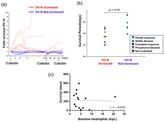 Specifically, while there was no tumor response (mRECIST) in the phase 2b (TRAVERSE) study of the maximum tolerated dose (MTD) of VOV (i.t., 1 × 109 pfu/dose) against refractory liver cancer, durable tumor response and survival were observed in phase 1 and phase 2a with doses below the MTD. Among various factors analyzed including complete blood count (CBC) parameters, serum biochemistry, cytokine changes, adaptive immune cell changes, fever patterns, secondary virus replication, and neutralizing antibody production, only an increase in neutrophils after VOV administration was correlated with poor clinical outcomes. Baseline neutrophil count was not associated with survival benefit (Figure 2). They are interesting because they may reflect the recently highlighted functional heterogeneity of circulating neutrophils increased after the administration of immunotherapy [36].