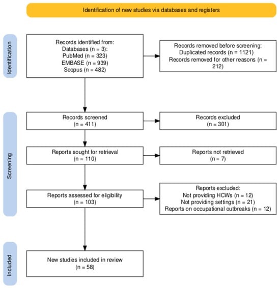 The main characteristics of the included studies are summarized in Table 1. Briefly, the studies reported on a timeframe ranging from 1988 [112] to 2024 [114], with four studies including samples collected during and after the SARS-CoV-2 pandemic [107,114,119,129]. The sample size ranged from 73 HCWs [128] to 10,576 [119]. Overall, the large majority of included studies were full papers from peer-reviewed medical journals, with a single preprint report [107], and two conference reports [79,126]. The majority of studies were from Turkey (7 out of 58, 12.07%) [81,84,88,94,106,117,128], followed by Japan [83,103,104,108,126] and Spain [95,98,100,115,121] with 5 studies each, as well as by Italy [86,97,109,114], Korea [105,110,119,129], and the USA [57,58,62,112]. Most of included studies (i.e., 47 out of 58, 81.03%) were based on ELISA [46,55,57,61,62,63,79,80,81,82,83,84,85,86,88,89,90,91,93,94,95,96,97,98,99,100,101,102,107,109,110,111,112,113,114,115,116,117,119,121,122,123,124,125,126,127,128], with 8 further reports based on EIA [87,92,103,104,106,108,118,120], 3 on CLIA [58,105,129], and a single entry on latex agglutination assay [99]. Interestingly enough, 30 studies also included data on measles [46,63,79,80,81,83,84,85,88,94,97,98,102,103,104,106,107,108,109,110,113,114,115,117,119,123,124,126,128,129] and 24 on rubella [46,63,79,80,81,83,84,85,88,97,102,103,104,106,108,109,113,114,115,117,118,123,124,126], with 23 studies reporting seroprevalence data on VZV, measles, and rubella [46,63,79,80,81,83,84,85,88,97,102,103,104,106,108,109,113,114,115,117,123,124,126].